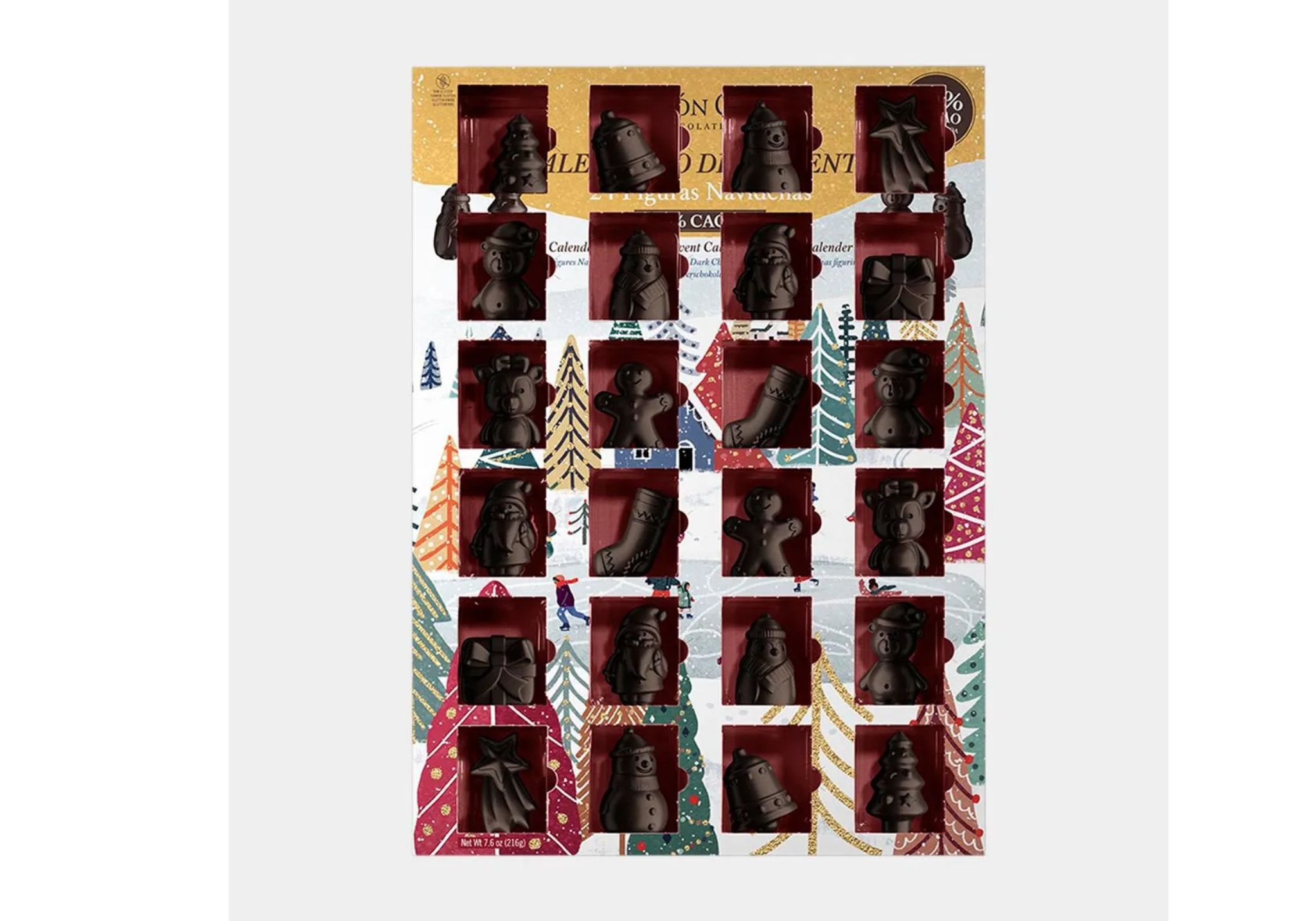 Calendario de adviento con figuritas de chocolate 70% en 3D.