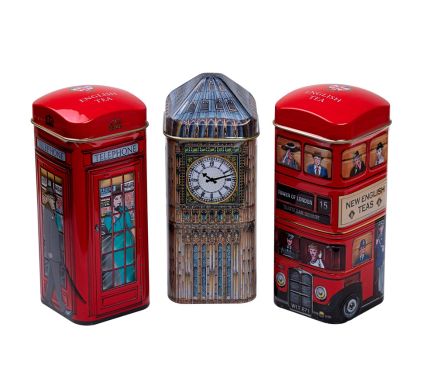 Juego de latas que representa 3 emblemas de Inglaterra: la auténtica cabina de teléfonos, el bus rojo londinense y el Big Ben. Cada lata contiene 14 bolsitas de English Breakfast Tea: una mezcla clásica y deliciosa que no puede faltar entre los amantes del té negro.