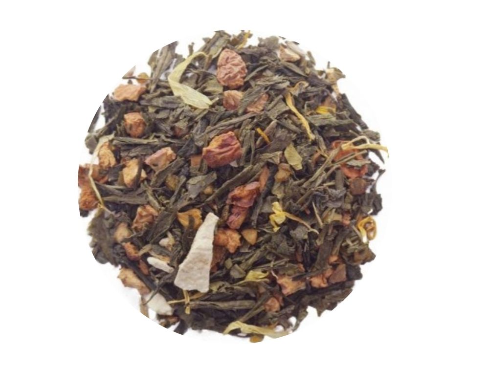Ingredientes: Té verde China Sencha, manzana, astillas de canela, piel de naranja, caramelo (azúcar, jarabe de glucosa, crema, manteca, sal de Guerande), aroma natural, caléndula.