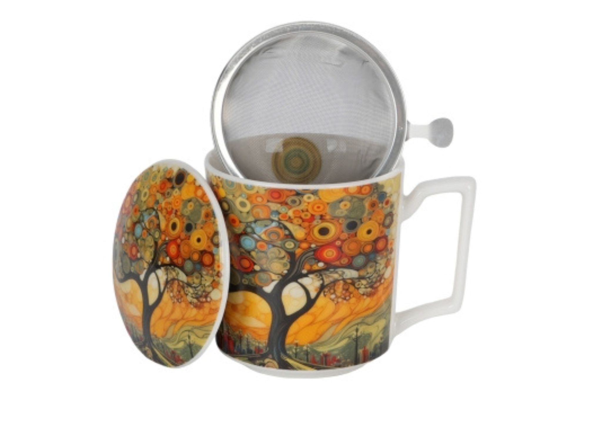 Tisanera Árbol de la Vida de la colección Modern, fabricada en porcelana New Bone China. Este modelo está decorado con una imagen moderna del árbol mágico, que simboliza la fuerza y el crecimiento en armonía con la naturaleza. Los colores suaves y pasteles se integran perfectamente con los tonos intensos y cálidos.