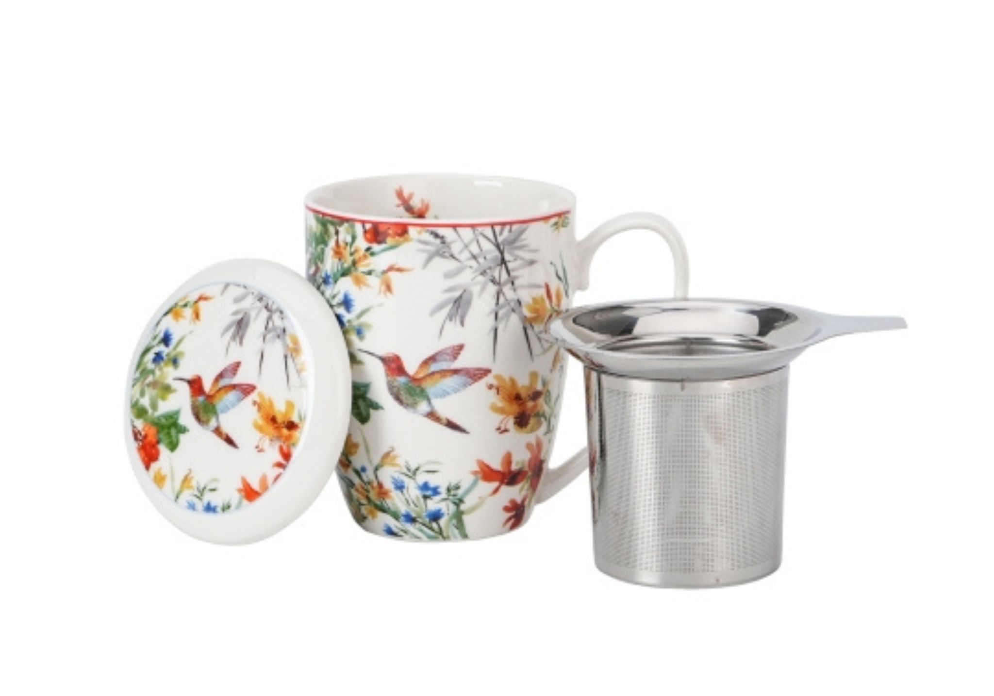Tisanera de la colección Clásicos Florales fabricada en porcelana New Bone China. Se caracteriza por su color blanco de fondo estampado con coloridos colibrís y vistosas flores.